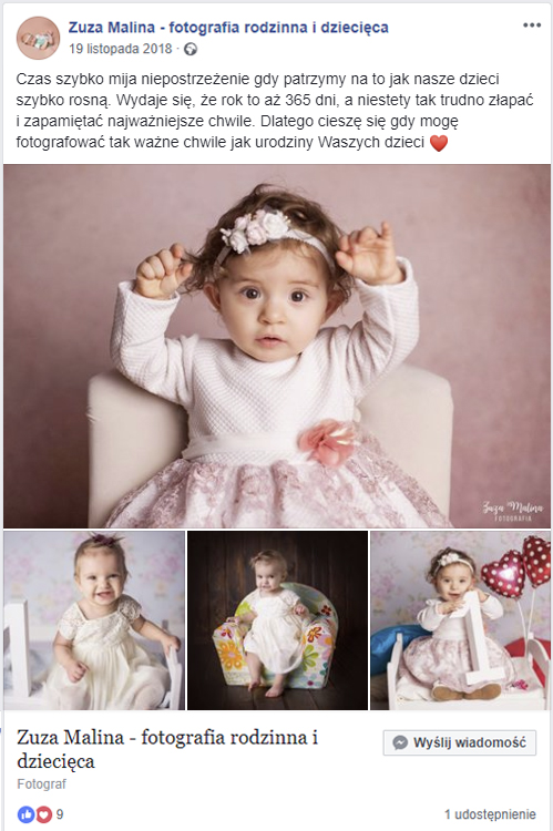 Tak jak wcześniej wspomniałem wykorzystamy istniejący post z naszego fanpage'a. Jeśli nie jest jeszcze opublikowany to musisz to zrobić zanim przejdziesz do kreowania kampanii reklamowej. Tworząc taki post postaraj się aby treść nie brzmiała jak jedna wielka reklama. Nikt dzisiaj nie lubi nachalnej promocji. Napisz coś lekkiego i chwytliwego. Podkreśl dlaczego fajnie jest mieć takie zdjęcia i wspomnij dlaczego warto z Tobą współpracować. Jeśli posiadasz stronę internetową i do niej chcesz kierować klientów to w opisie wklej link. Załącz w poście od 4-12 zdjęc (pamiętaj, żeby to nie był album tylko post z wieloma zdjęciami). Taka kreacja reklamowa będzie znacznie bardziej atrakcyjna niż pojedyncze zdjęcie. Pamiętaj aby dodać przycisk "Wyślij wiadomość".