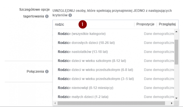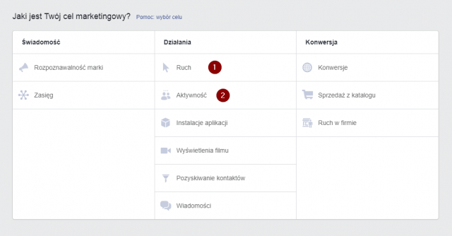 Z wszystkich dostępnych celów będą interesowały nas jedynie dwa. "Aktywność" (2) jeśli bardziej zależy Ci na tym aby zdobywać zaangażowanie i zapytania bezpośrednio na Facebooku oraz "Ruch" (1) jeśli chcesz kierować swoich potencjalnych klientów na stronę internetową i stamtąd pozyskiwać zapytania.