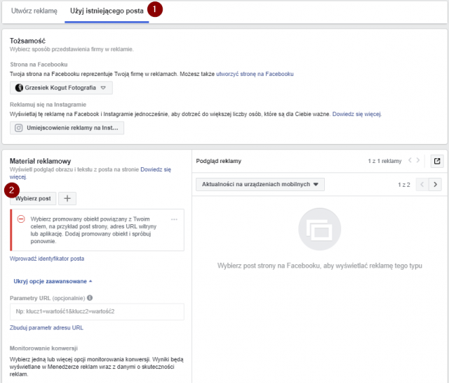 Materiał reklamowy (kreacja reklamowa) została już przez Ciebie utworzona w punkcie 1. Aby z niego skorzystać, w ostatnim etapie tworzenia kampanii wybierz "Użyj istniejącego posta" (1), a poniżej kliknij "Wybierz post" (2). W tym momencie wyświetli Ci się lista Twoich postów do wyboru. Z listy wybierz ten, który chcesz promować.