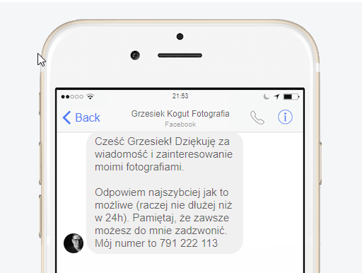 4a. Informacja cenowa - wysłana przez FB - korzystam z kilku zapisanych odpowiedzi, które mogę wybrać z poziomu messengera w przeglądarce lub w aplikacji Menedżer stron. Dzięki temu wysłanie odpowiedzi z informacją cenową zajmuje mi 3 sekundy od sprawdzenia czy termin mam wolny. Wiadomośc zawiera kilka zdań na temat tego jak pracuję oraz link do oferty w PDF.